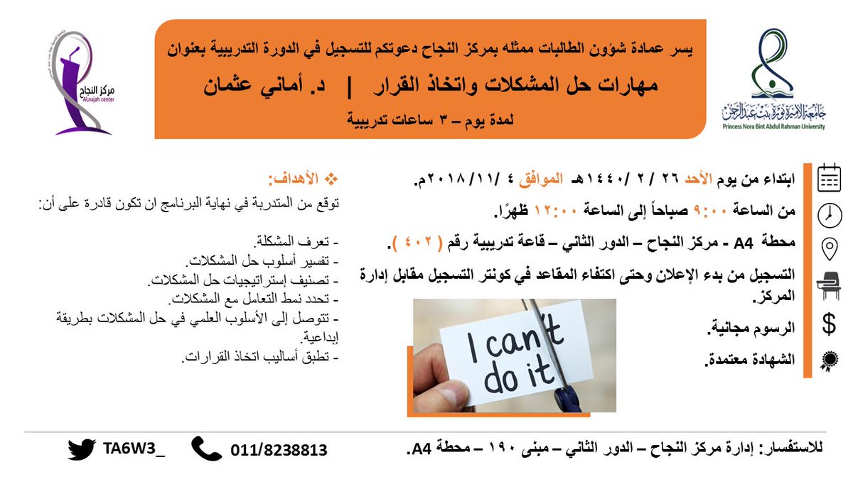 جامعة الأميرة نورة On Twitter دعوة من عمادة شؤون الطالبات مركز النجاح للتسجيل في دورة تدريبية بعنوان مهارات حل المشكلات واتخاذ القرار جامعة الأميرة نورة Pnu Https T Co Vf6dbvjkuj
