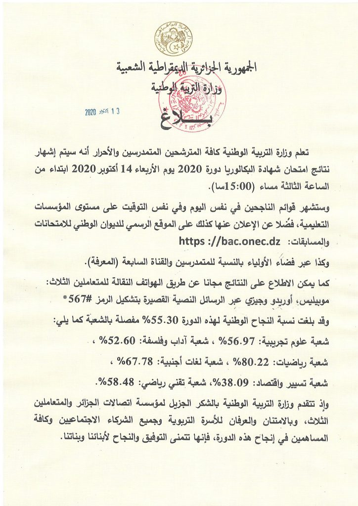 نتائج امتحانات البكالوريا الجزائر 2020 نتيجة امتحان شهادة البكالوريا في الجزائر سبتمبر 2020